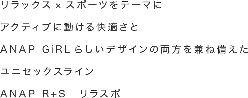 リラックス×スポーツをテーマにアクティブに動ける快適さとANAP GiRLらしいデザインの両方を兼ね備えたユニセックスラインANAP R+S リラスポ