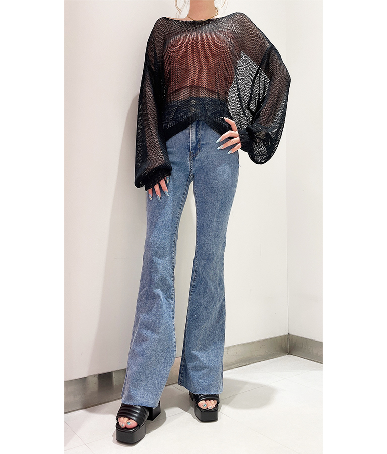 ヘルシーな肌見せスタイル★ 透かし編みニットなので夏場でも涼しげに着こなせます。 サンダルで足元を見せるのも、コーデを涼しげに見せるポイント。