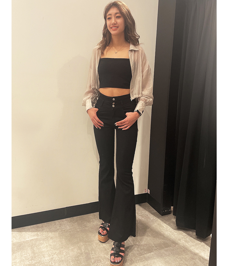 フレアパンツはハイウエスト&ストレッチが効いていて足長効果も動きやすさもバツグンです♪