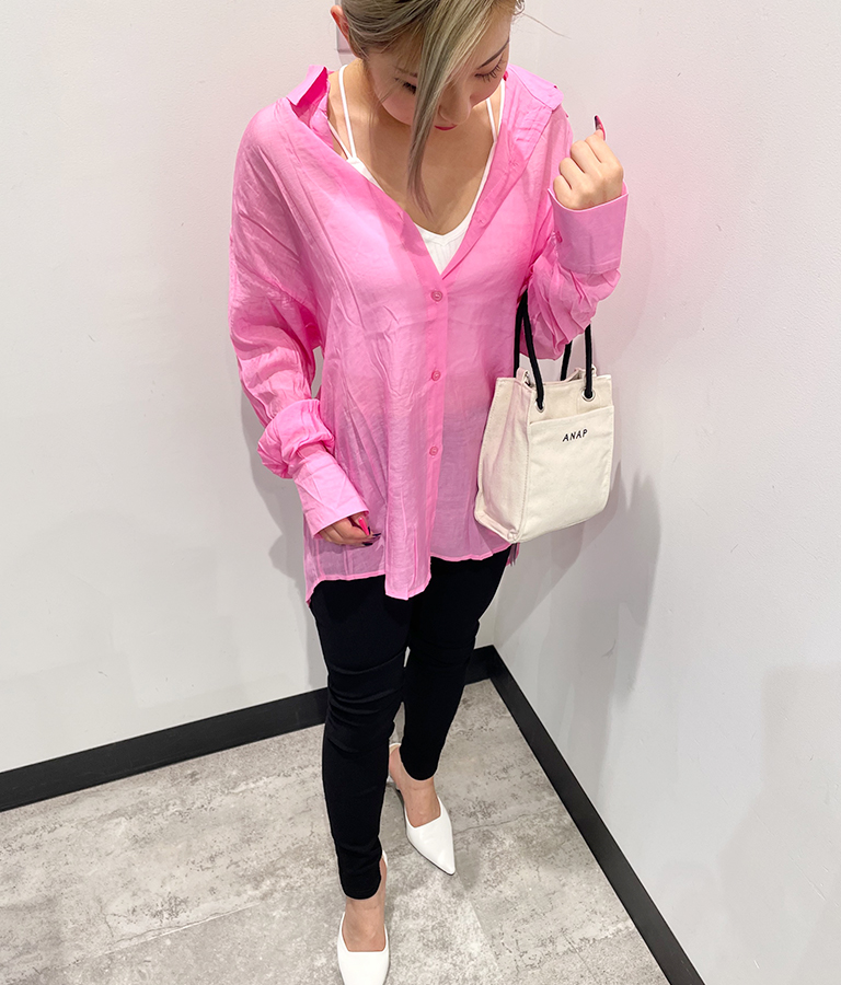 流行のシアーシャツも、ビビッドなピンクで個性的に!