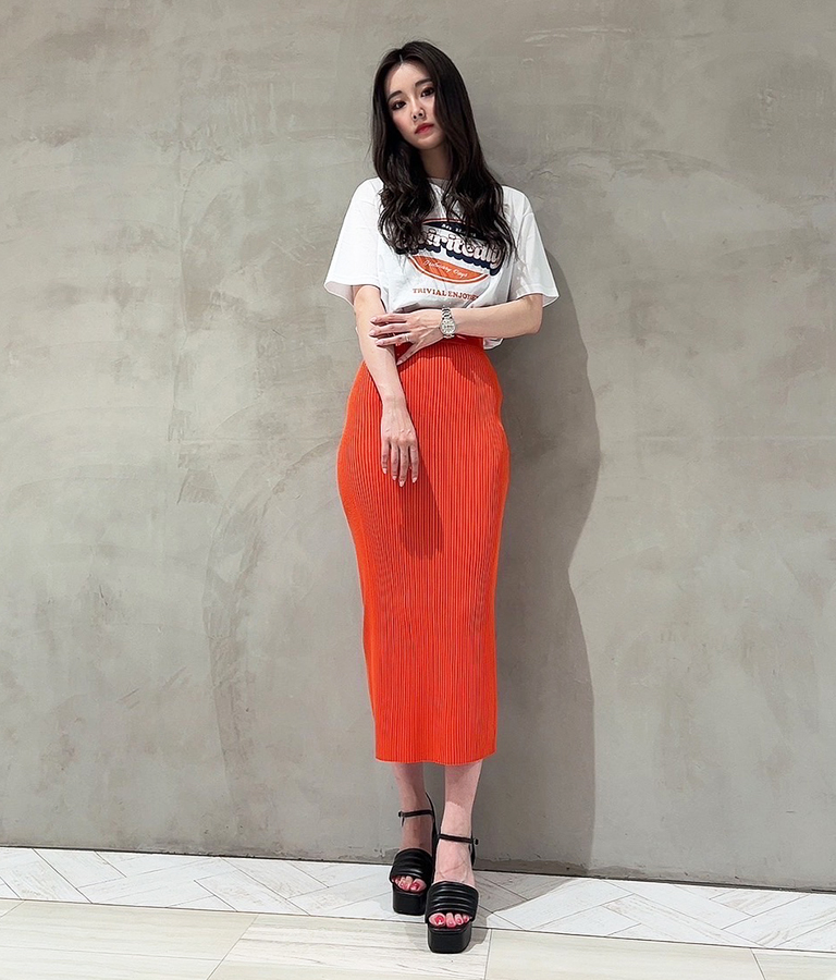 Tシャツのロゴとスカートの色を合わせて統一感を持たせました。 スカートはウエストゴム入りで着心地◎ バックスリット入りで足さばきも快適です。