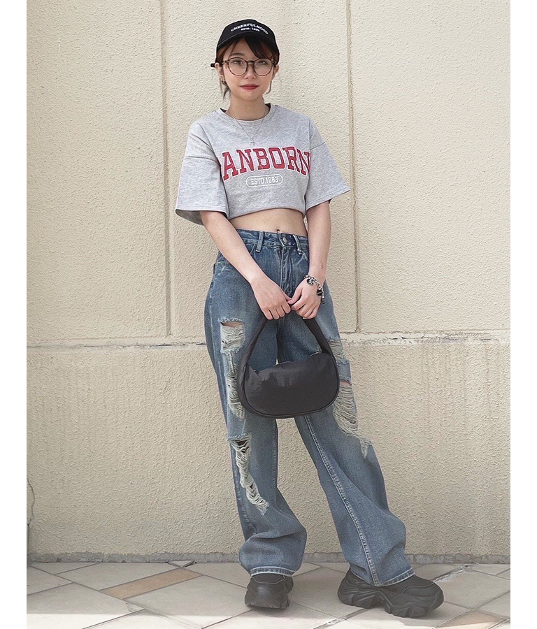 流行のY2Kスタイル♪ トップスはコンパクトに、ボトムスと足元はボリュームを出すのがポイント。