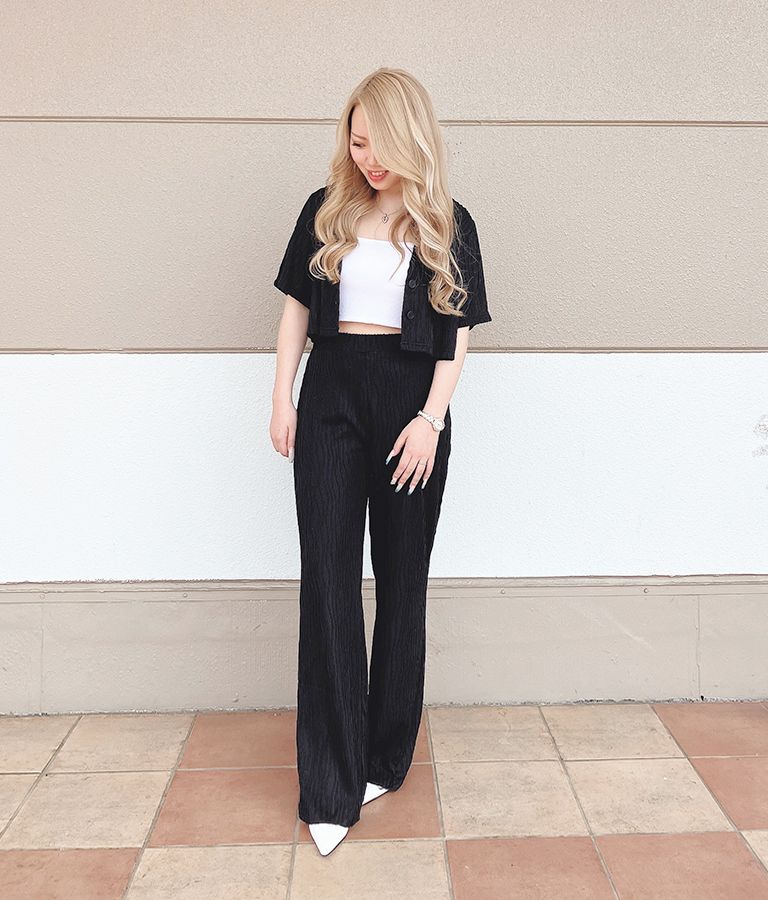 ブラックのセットアップにホワイトの小物が目を惹きます♪ 涼しげな素材なのでブラックでも軽やかな雰囲気と着心地です。