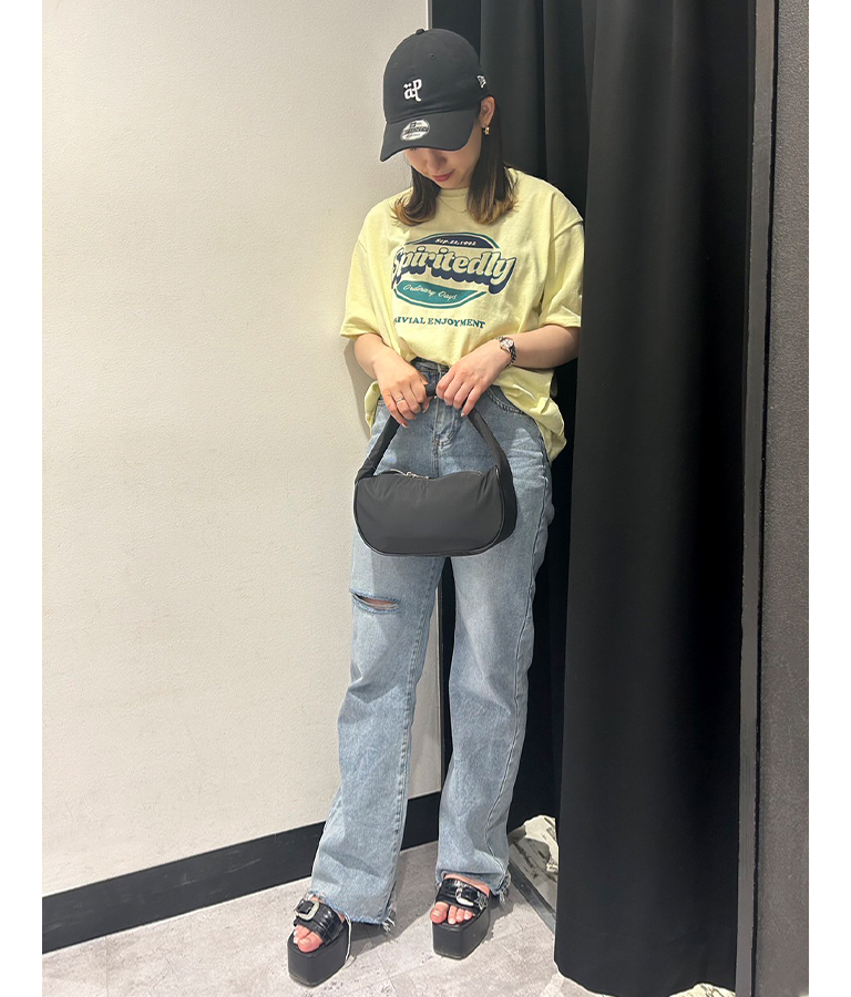 Tシャツ&デニムでカジュアルコーデ! Tシャツを前だけインしてこなれ感を演出。 キャップとハンドバッグがコーデのアクセントになっています♪