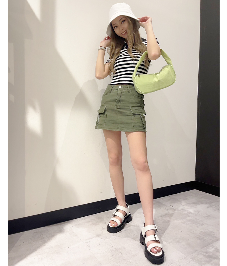 バケットハットとサンダルの色を合わせて統一感を持たせました!