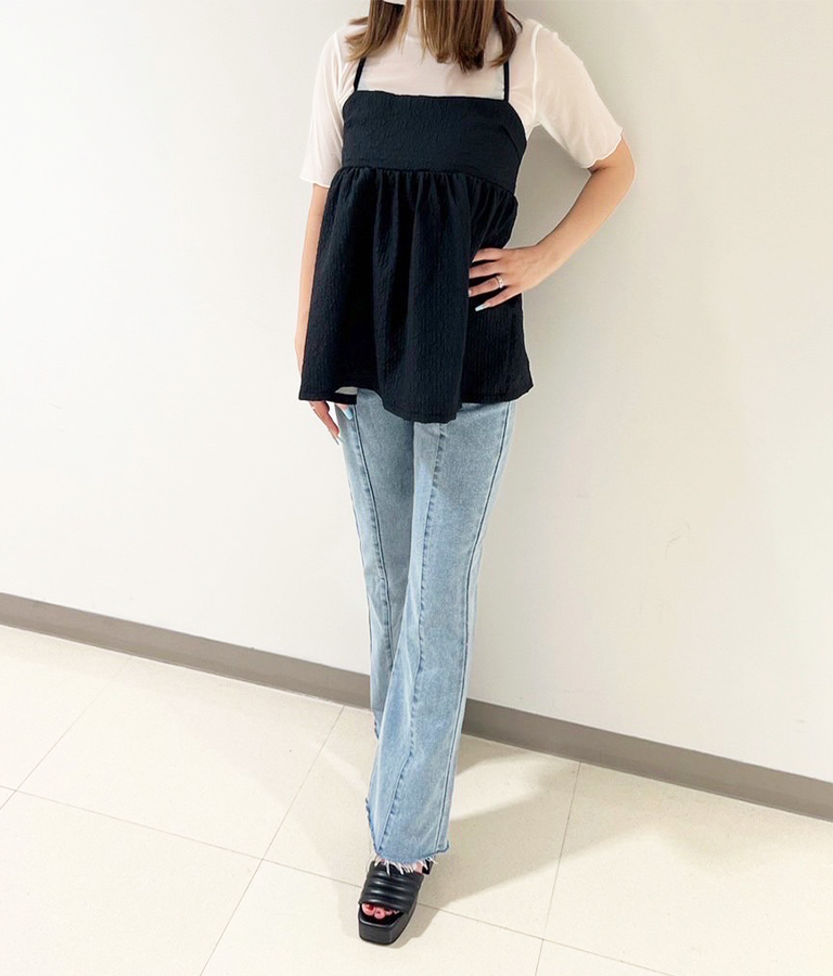 シアーシャツとキャミソールはセットなので、これだけで重ね着コーデが完成します♪ デニムとサンダルを合わせて大人可愛く!