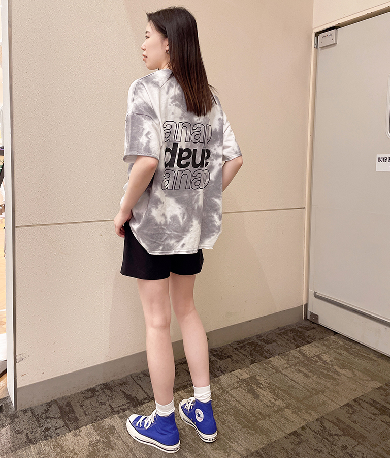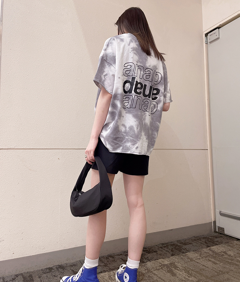 ANAPロゴTシャツにショートパンツを合わせたANAPらしいストリートコーデ。 Tシャツを前だけインすることで、こなれ感を出せます。