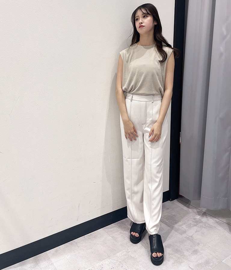 上品かつ抜け感を演出できるホワイト×ベージュコーデ。 サンダルとバッグはブラックを合わせることでコーデが引き締まります。