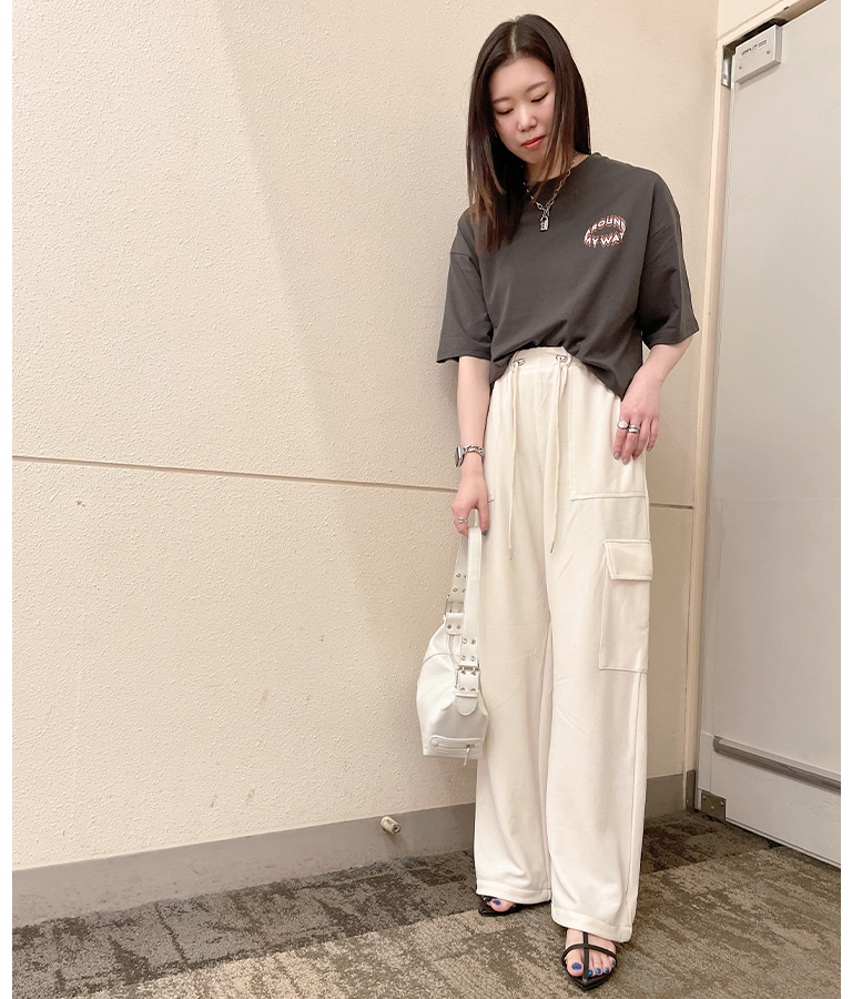 ビッグTシャツと流行のカーゴパンツを合わせたリラックス感のあるカジュアルコーデ。 カーゴパンツは裾を絞らないことでワイドパンツのように着こなすこともできます♪