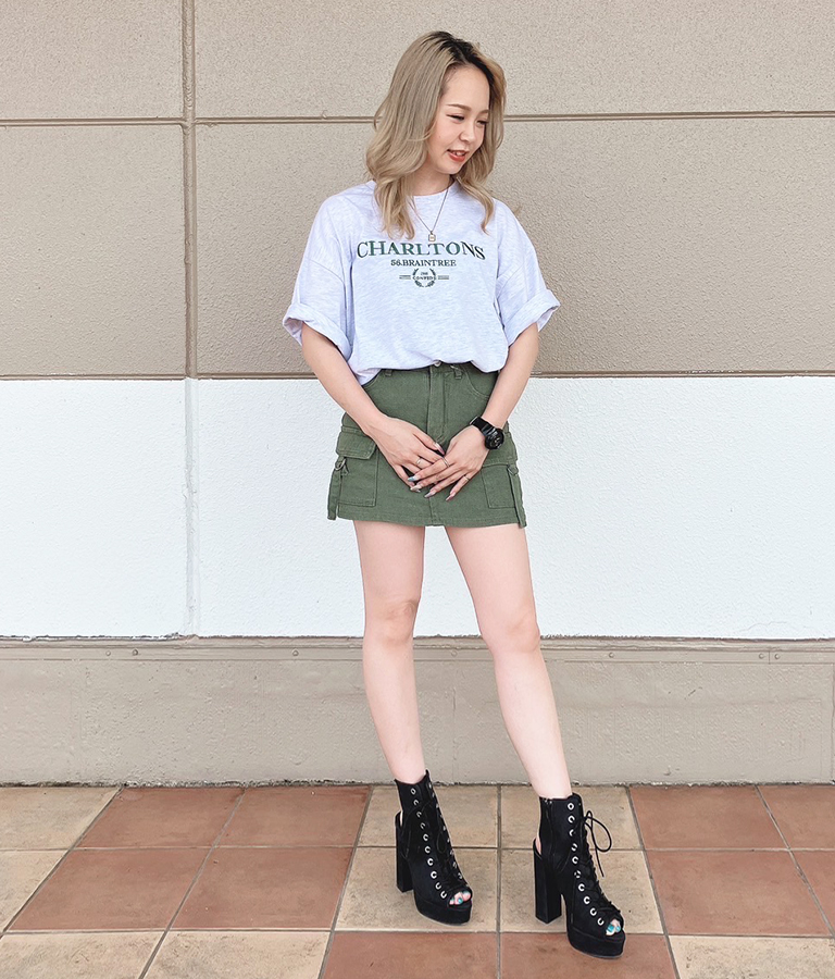 Tシャツ×ショート丈のボトムスにレースアップサンダルを合わせてスパイスの効いた着こなしに。 カーゴスカートはインパン付きなのでショート丈でも安心◎