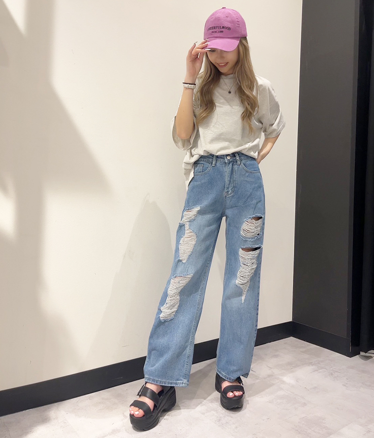 デニムは程よいダメージ加工で、シンプルなコーデもグッと引き立てます。