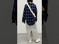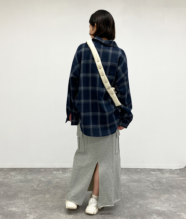 チェックシャツとスウェット素材のスカートを合わせたリラックス感のあるコーデ。