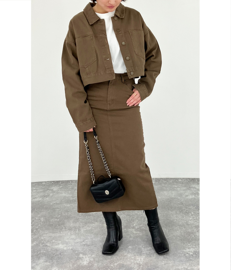 同素材のジャケットとスカートを合わせて、こなれ感バツグン◎