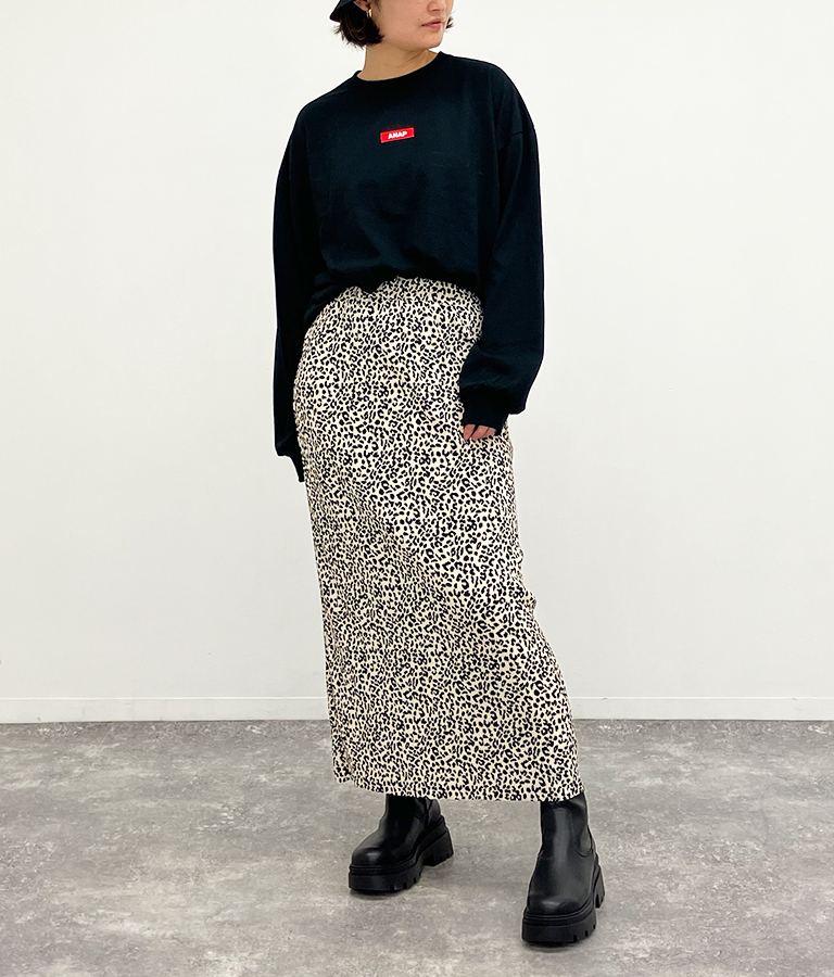 派手すぎないレオパード柄スカートにブラックのブーツを合わせて適度なエッジ感をプラス。