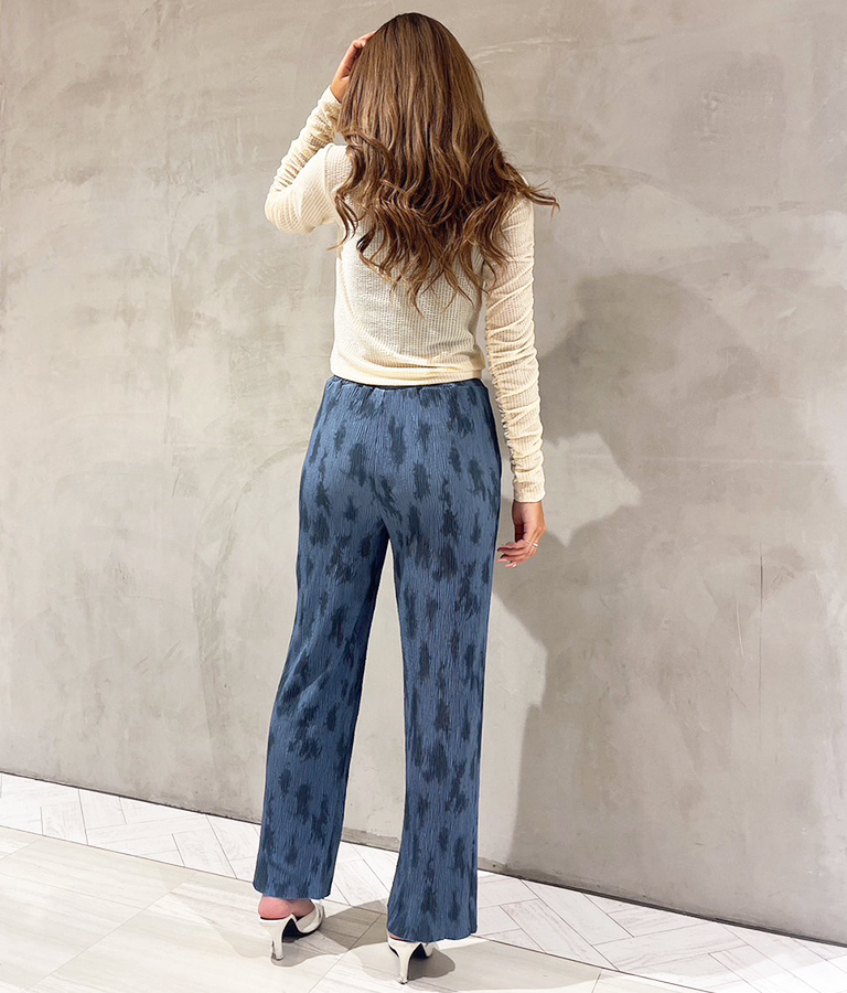透け感のあるデザインカットソーとニュアンス柄のプリーツパンツを合わせて、リラクシー感と大人っぽさを演出。 カットソーはパンツにインしてバランスよく。