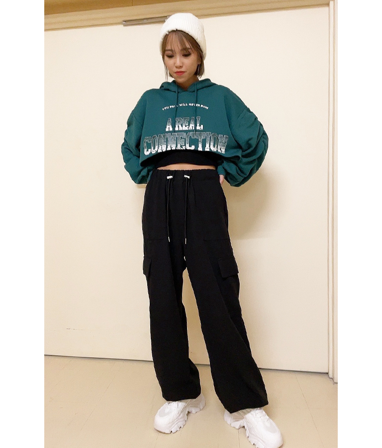 クロップド丈のパーカーとカーゴパンツでトレンドのY2Kスタイルも意識しました。
