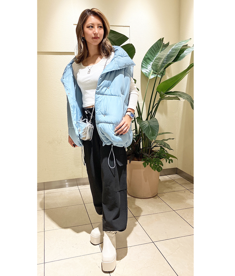 オーバーサイズのダウンベストとカーゴパンツでトレンド感たっぷり♪