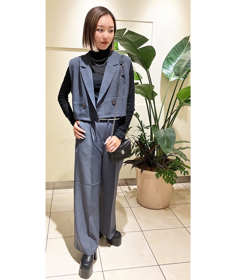 ベストとワイドパンツのセットアップでマニッシュな雰囲気に。