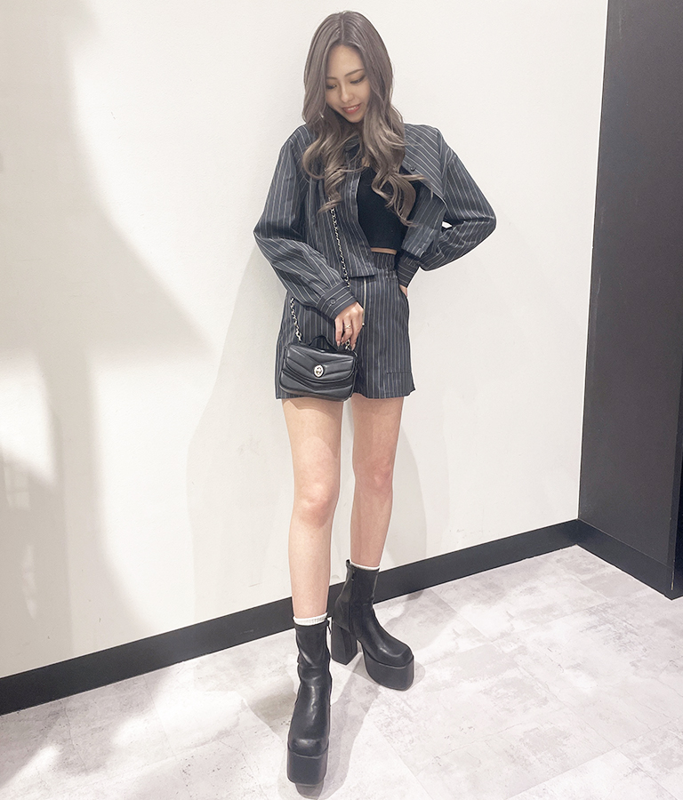 モードな雰囲気のセットアップコーデ♪ 前を開けてインナーを見せることで抜け感を演出。