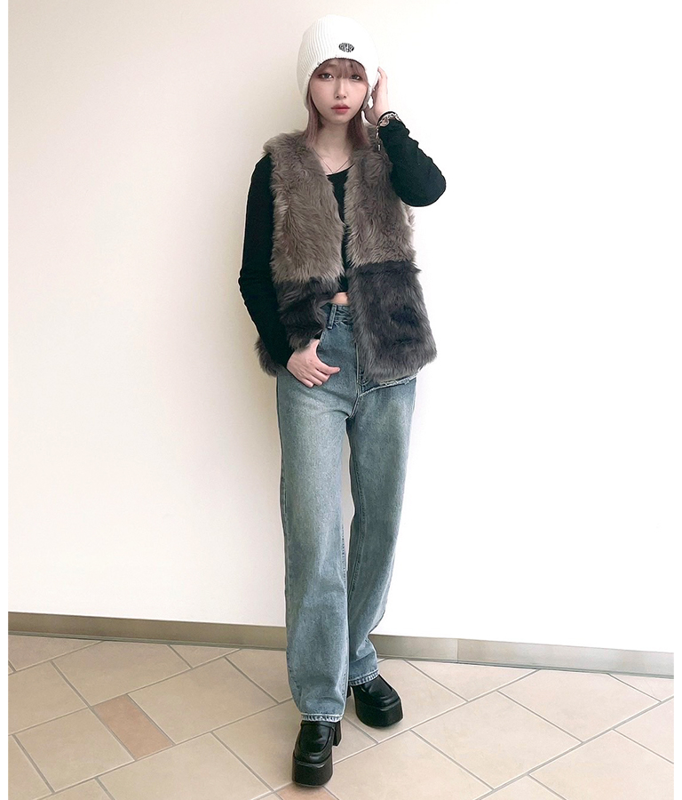 ミックスカラーのフェイクファーベストを羽織って、王道カジュアルコーデを格上げ♪ ダメージ加工のビーニーもコーデのアクセントに◎