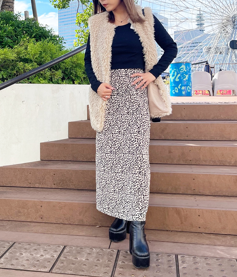 大人っぽいモノトーンコーデにボアベストを合わせて抜け感をプラス♪