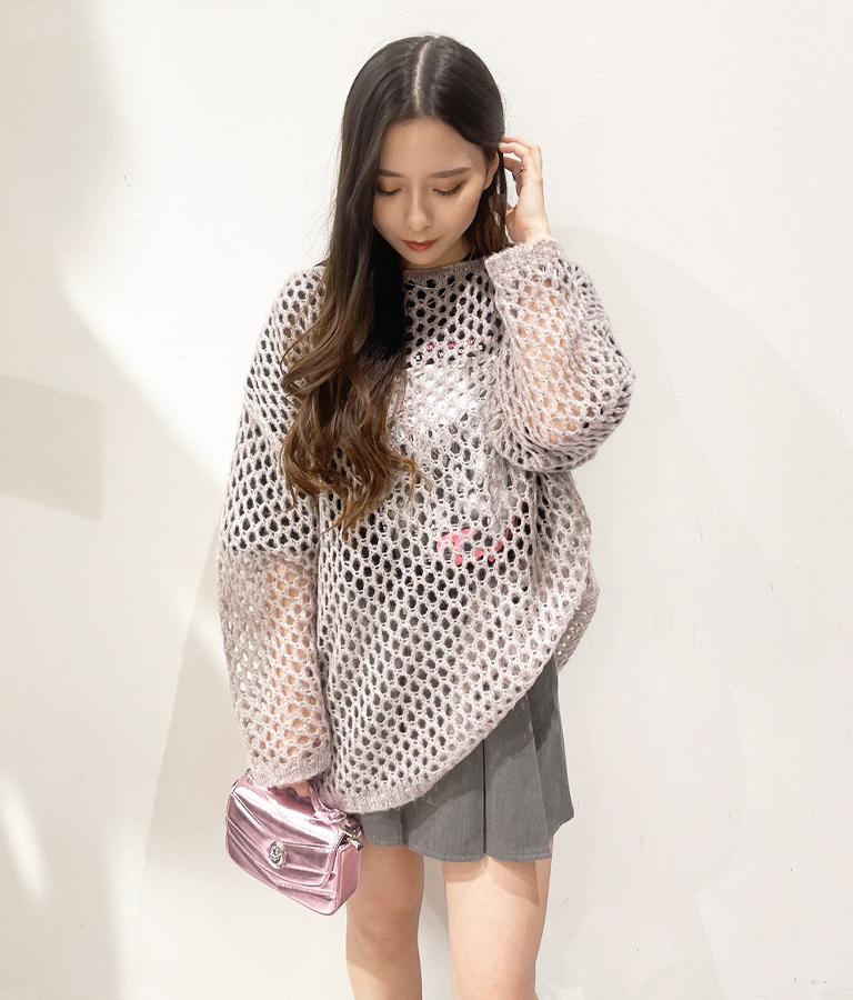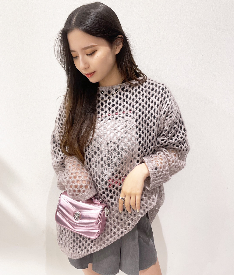 Tシャツの上にメッシュ編みニットを重ねたレイヤードスタイル!