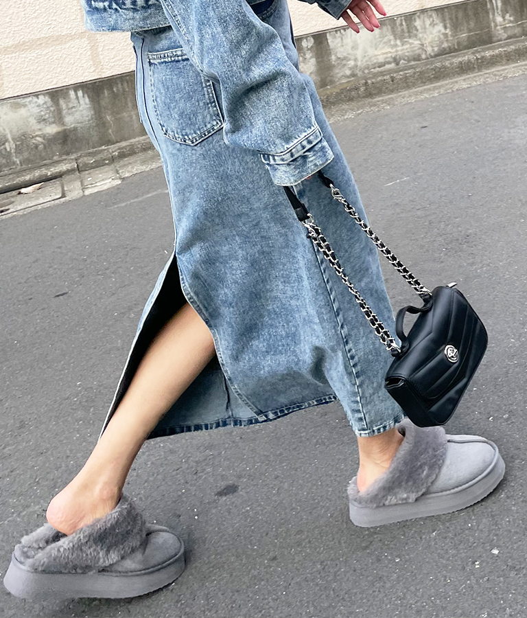 デニムと相性バッチリのムートンスリッポンもポイント。
