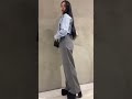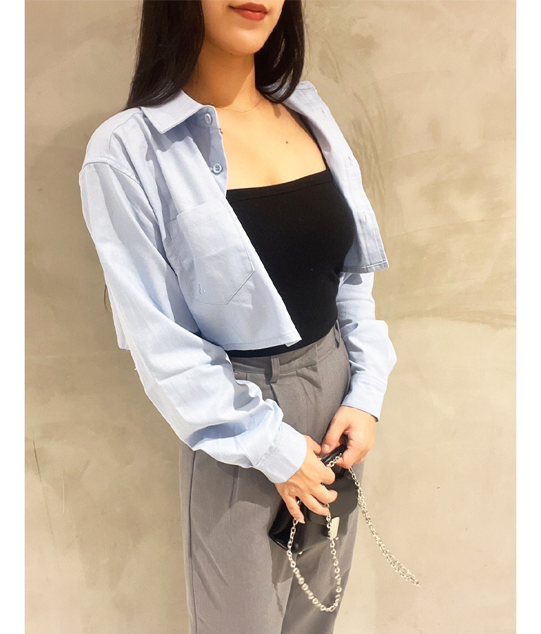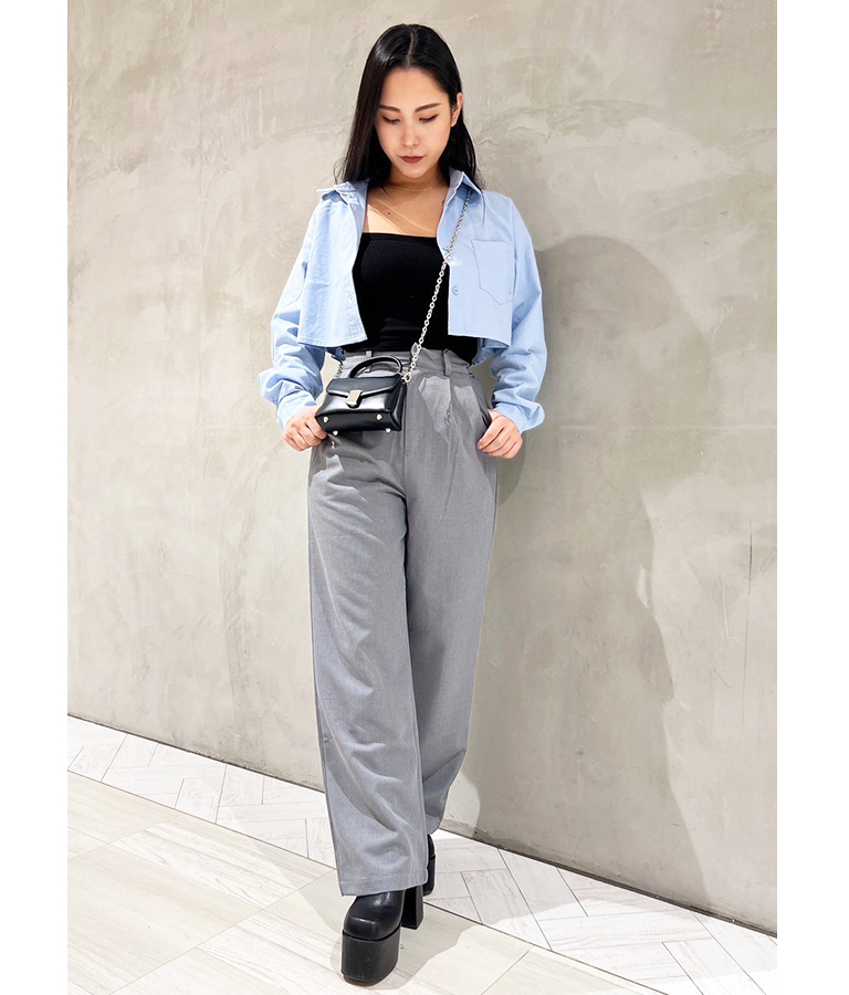 クロップドシャツに、ゆったりシルエットのスラックスを合わせてバランスよく。
