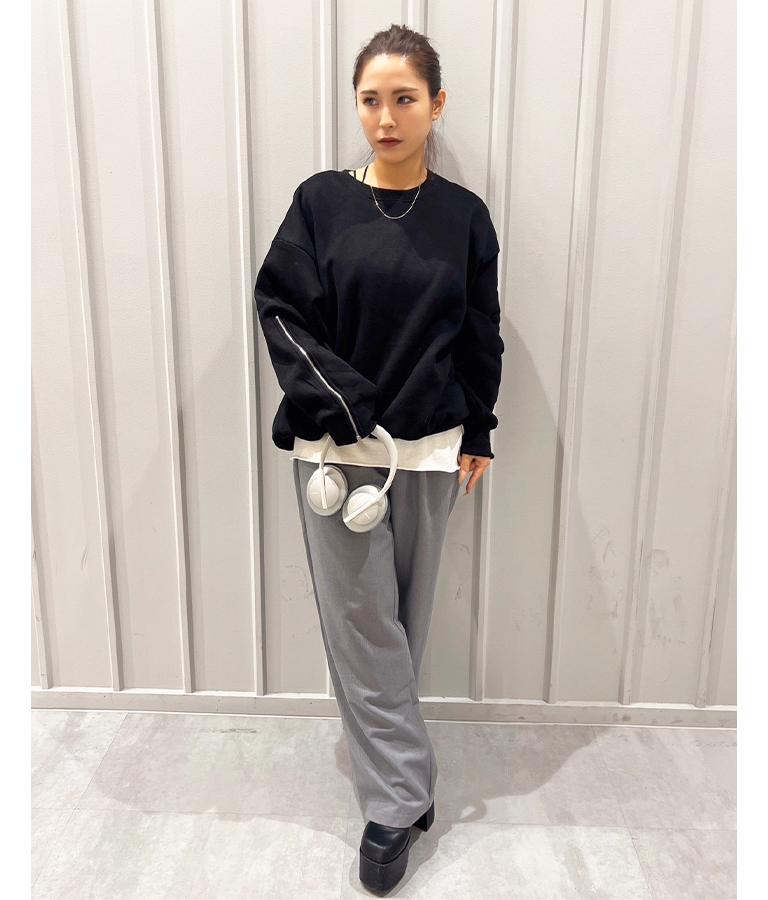 スウェットから白インナーをチラ見せさせて、こなれ感を演出。 リラックス感のあるシルエットにブーツを合わせてコーデにメリハリを持たせました!