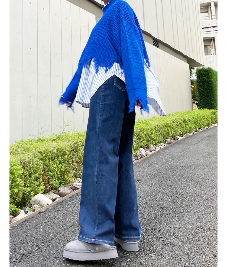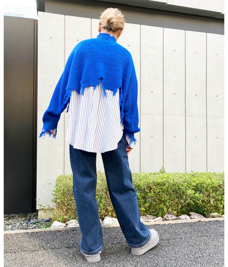 ダメージニットにストラップシャツを合わせて大人カジュアルコーデ。 シャツとクロップドニットの相性◎ こちらのデニムはストレスが効いていて履き心地も良く、シルエットもキレイで脚長効果になるので2色買いしました♪